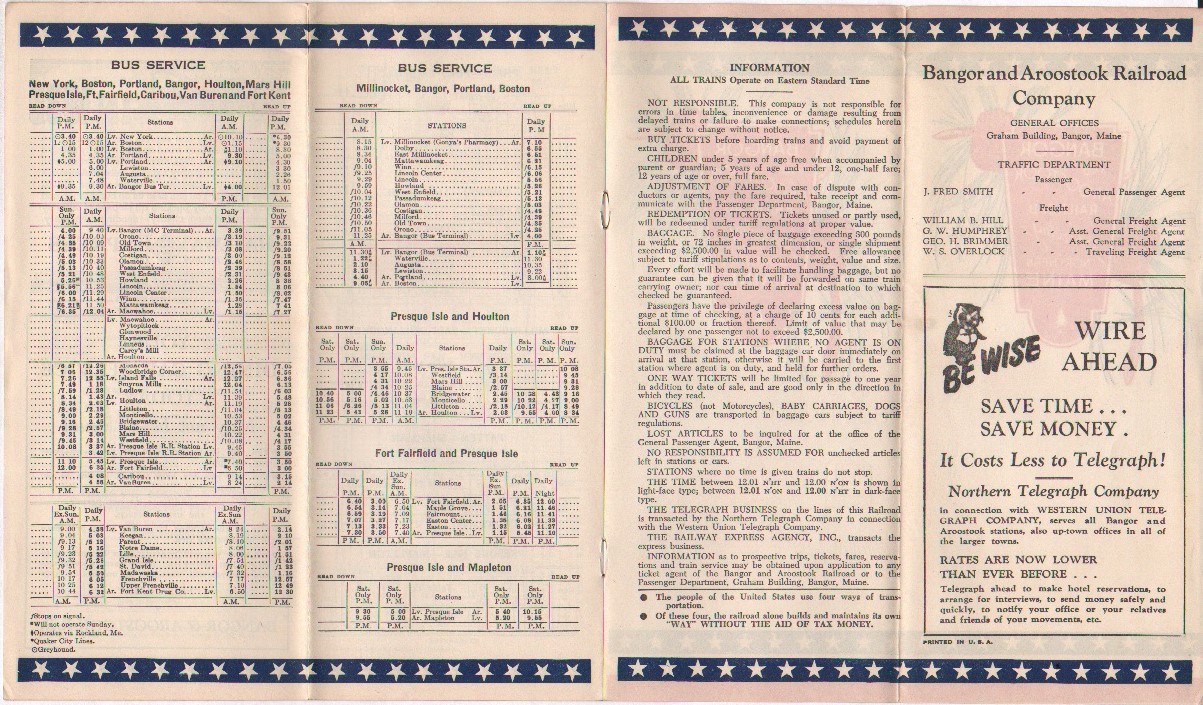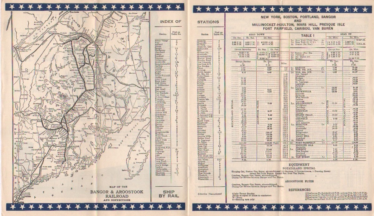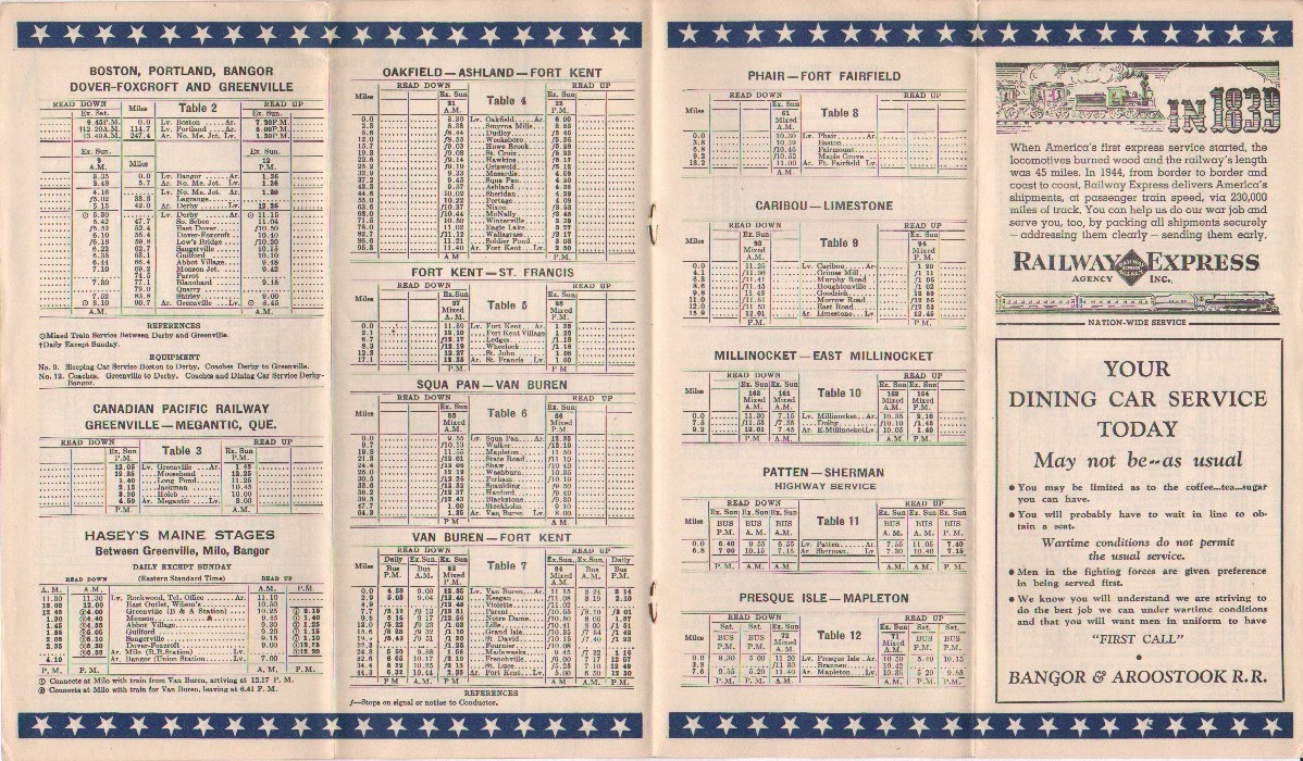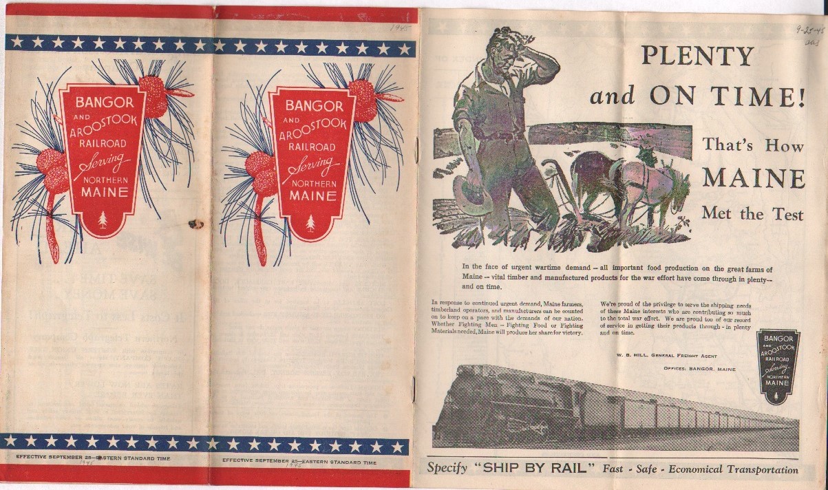 Note: This timetable has a handwritten note on it referencing 1945. The timetable itself does not list a year. It is most likely that this is 1944 as timetable appears to be identical, right down to the lack of a year on the covers. It is the editor's opinion that this timetable is from 1944 and the hand written note is incorrect. This is based upon a few factors. September 25, 1945 was a Tuesday. A quick spot check reveals that September 25, 1944 was a Monday. Further, other dates that timetables went into effect were also Mondays. Being the first day of the work week, it makes more sense for the timetable to be effective on a Monday. This timetable makes no mention of the trains #3 and #4 that were introduced late in 1944. Further, the REA add references 1944 as if it were the current year. Additionally, the Patten-Sherman bus service makes no mention of Island Falls - which would mean a return to a 1944 operational pattern. It makes no sense for Island Falls and trains #3 and #4 to appear in the August and October 1945 timetables in this collection, but be left out of the September one. The conclusion is that this is a mislabeled 1944 timetable and it has been included only for comparison purposes.