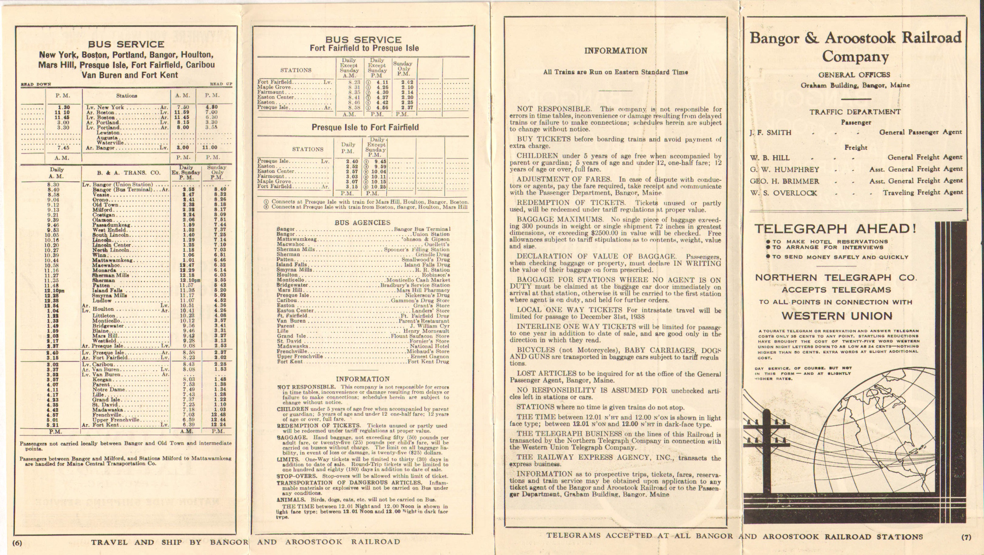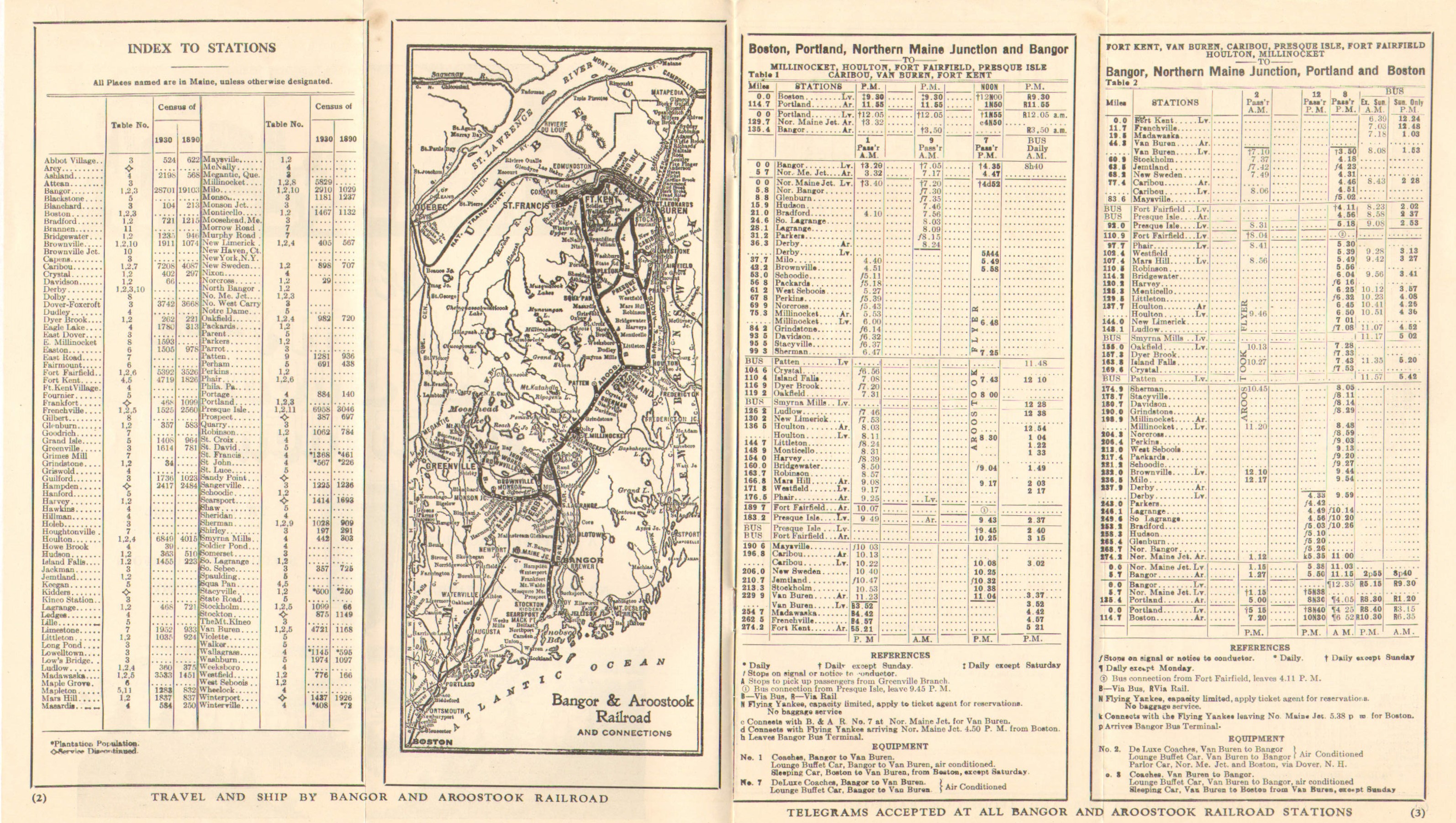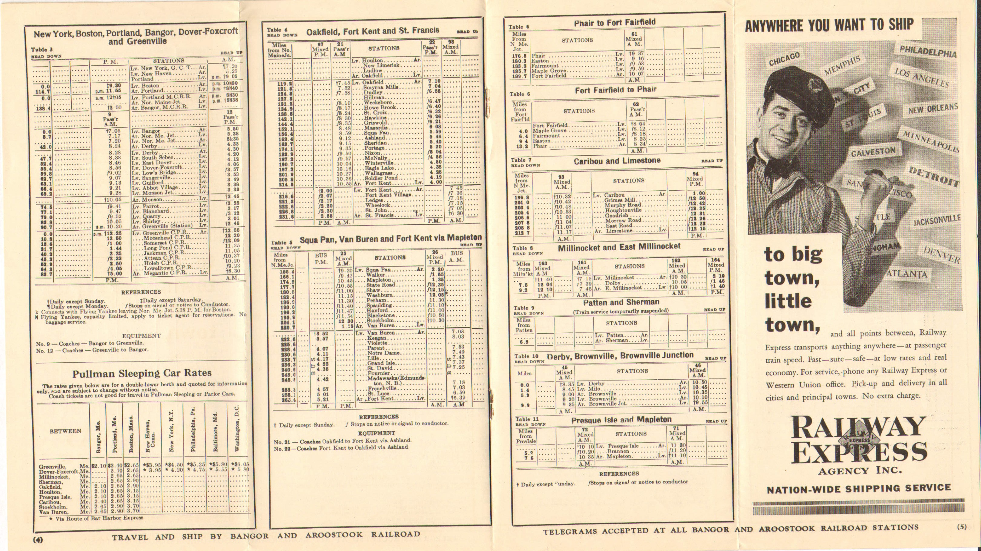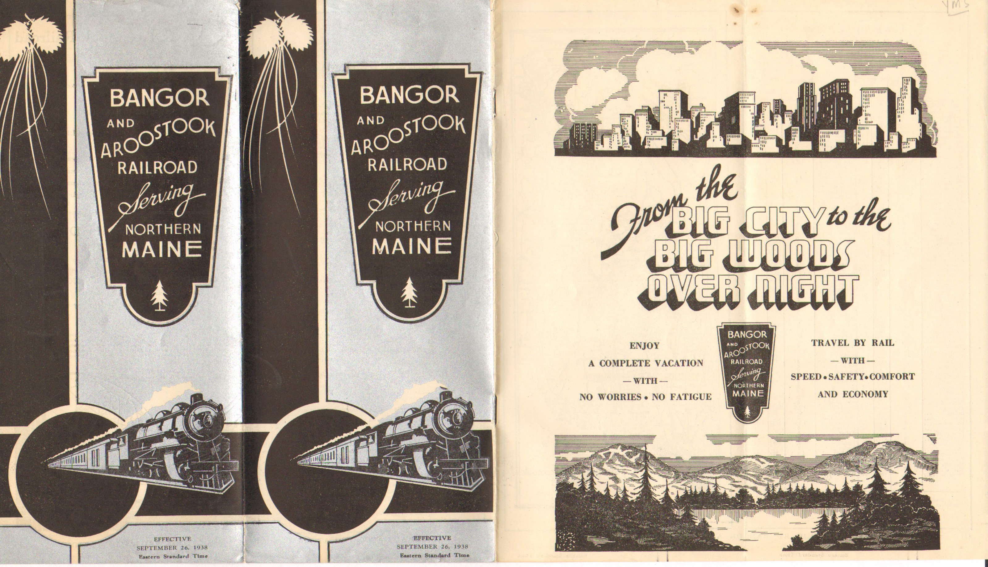 The blue cover remains in this 1938 edition, although the text is black. The two page interior is still pushing the idea you can ride a night train and get from the city to your vacation. Pullman service is still being offered and the bus service does not appear to have changed since the previous timetable.
