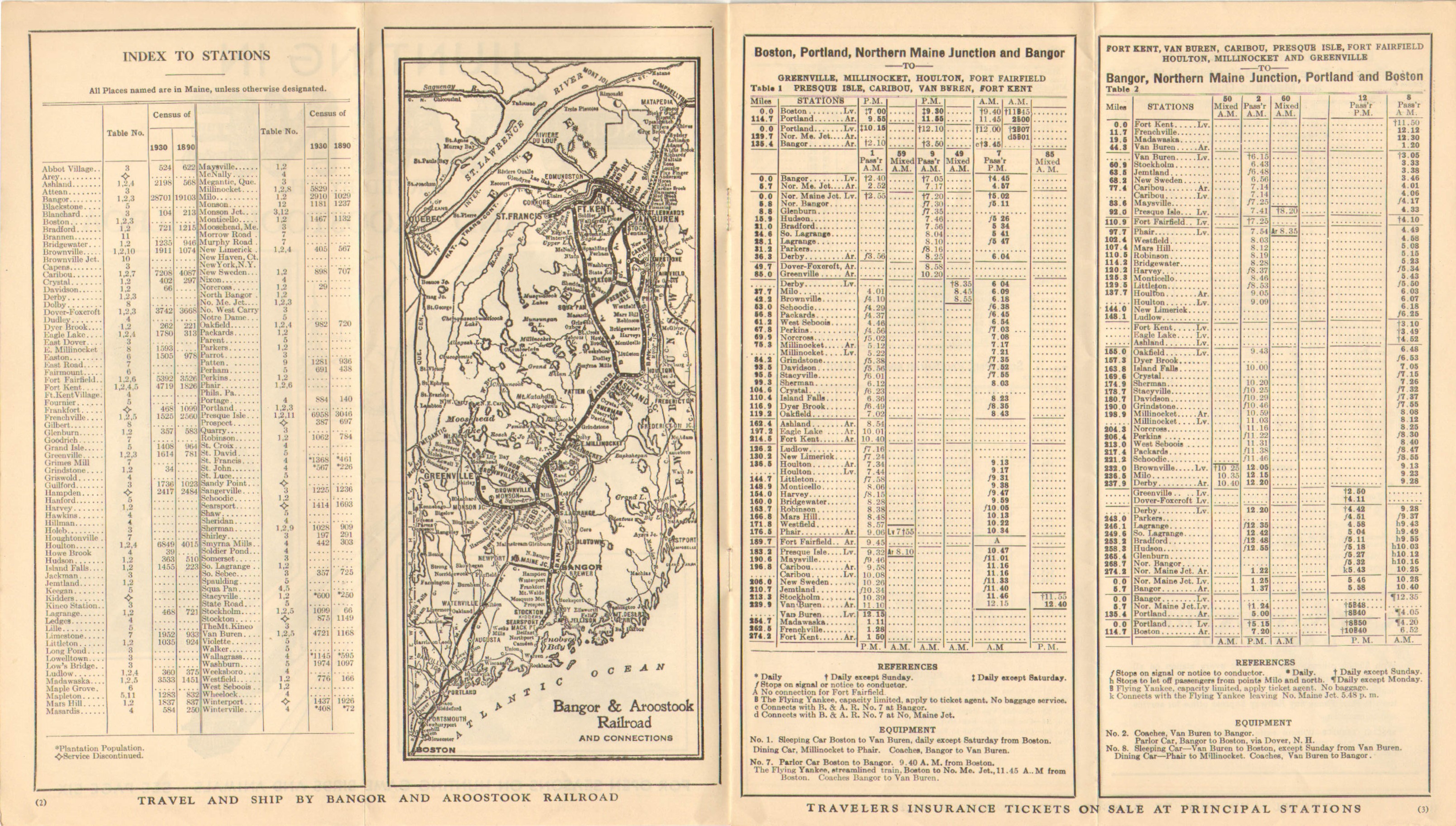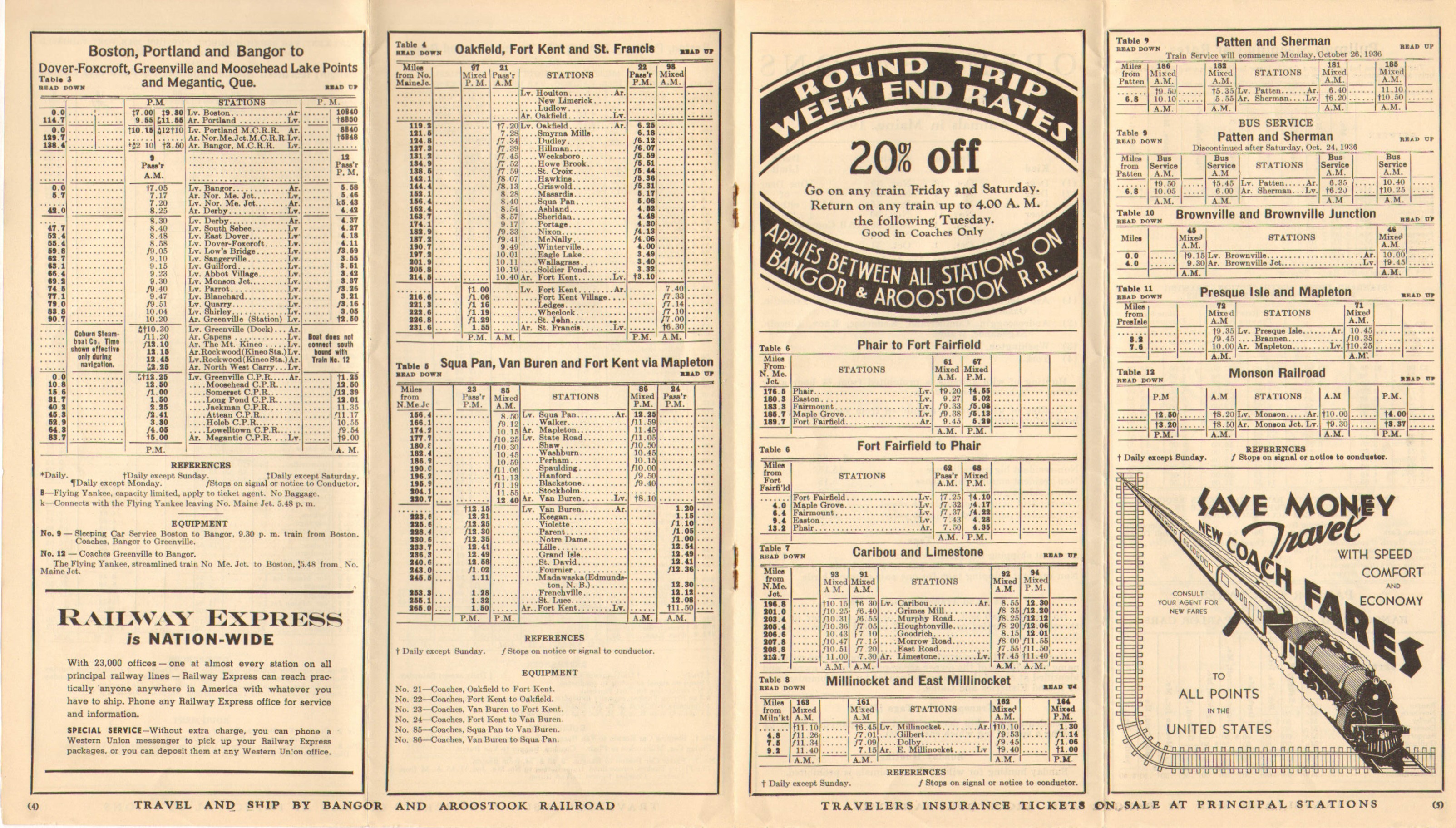 Looking at the Patten Branch mentioned in the last timetable, the bus service has been increased to two round trips, both in the morning. However there is a note that this service will be discontinued after Saturday October 24. Two mixed trains, running on essentially the same schedule, will commence on October 26th. Although not stated, this may be a response to the winter weather and its effect on the roads in Northern Maine. Aside from the Patten Branch service, no other large changes stand out.