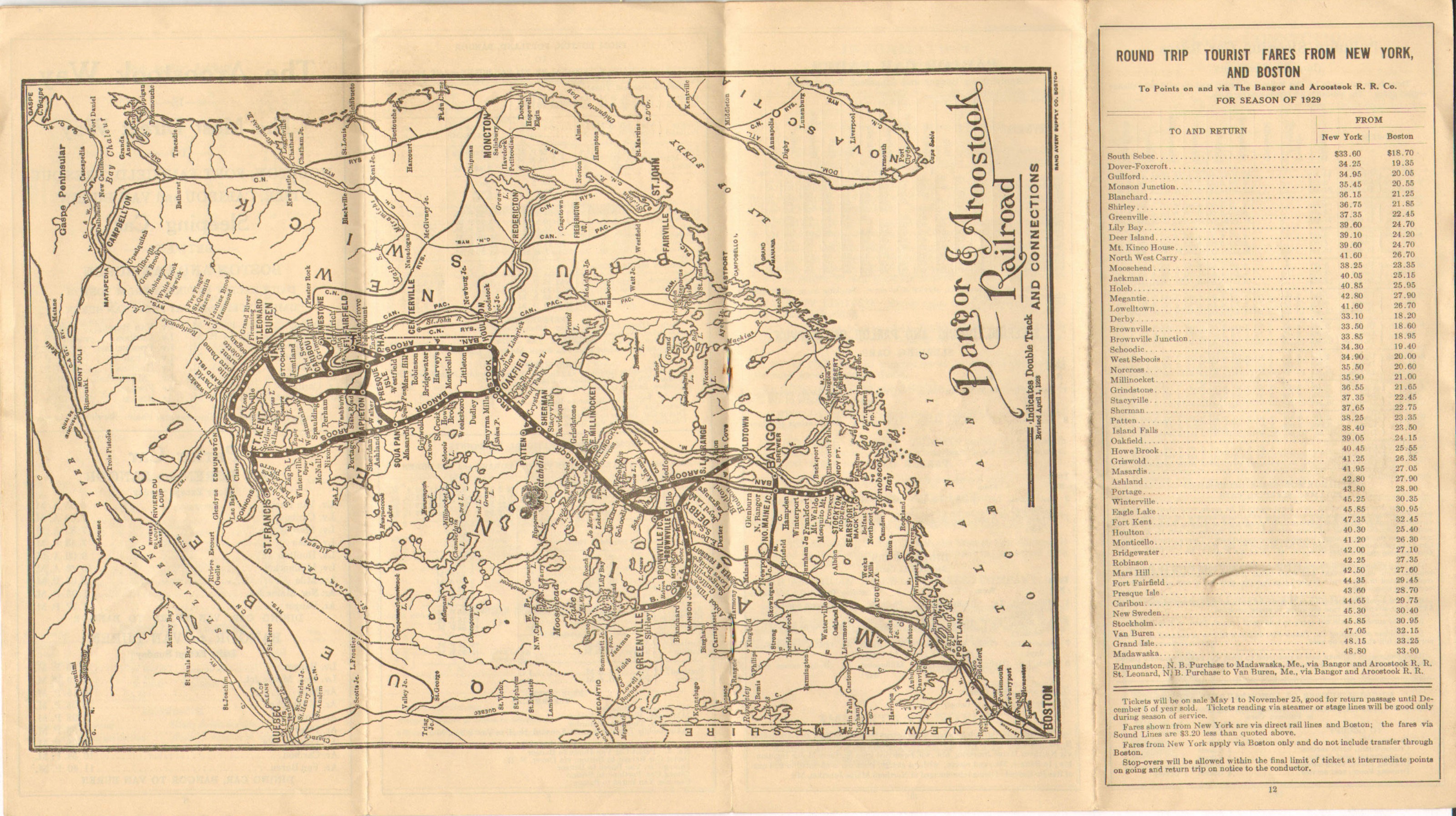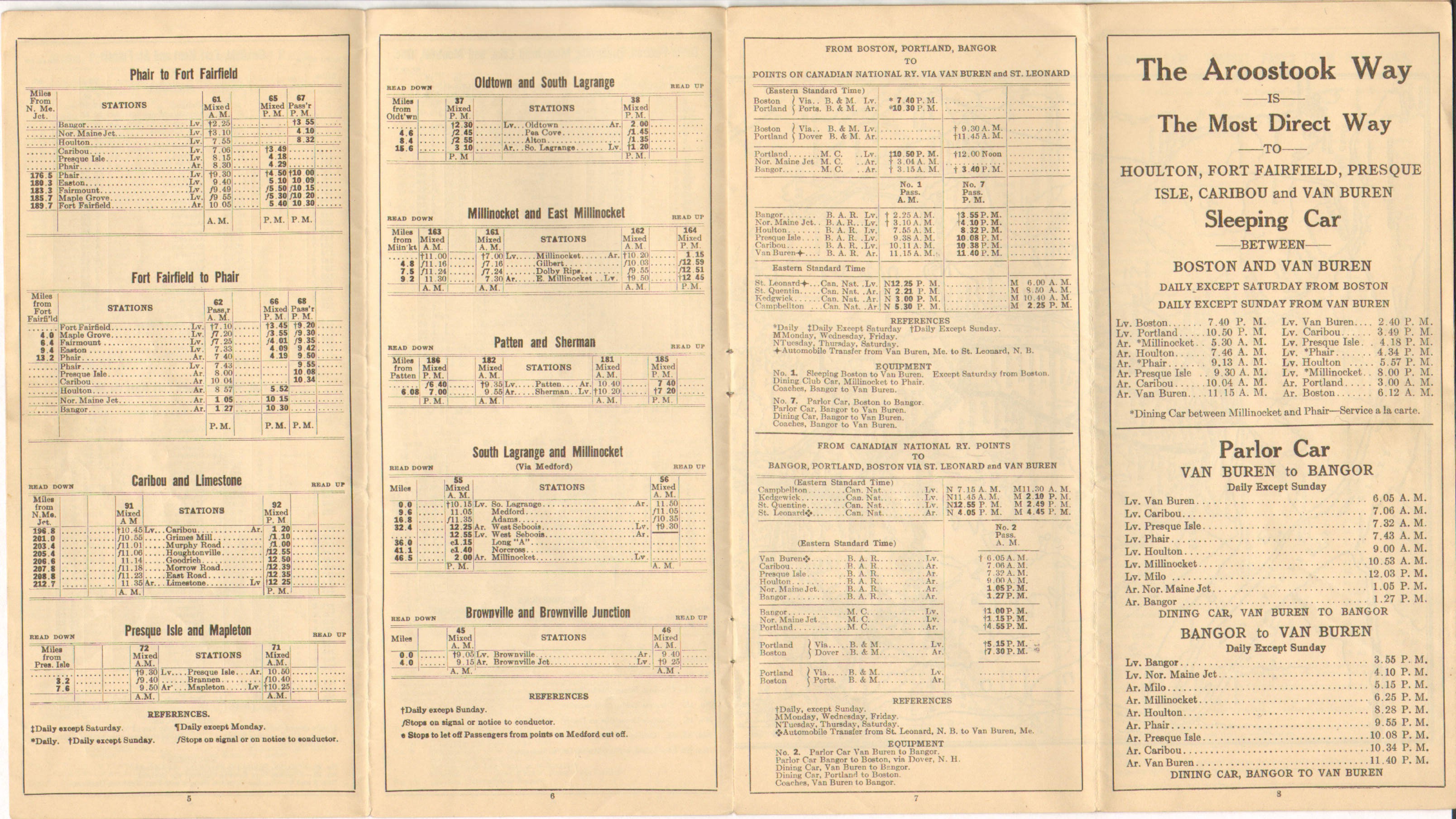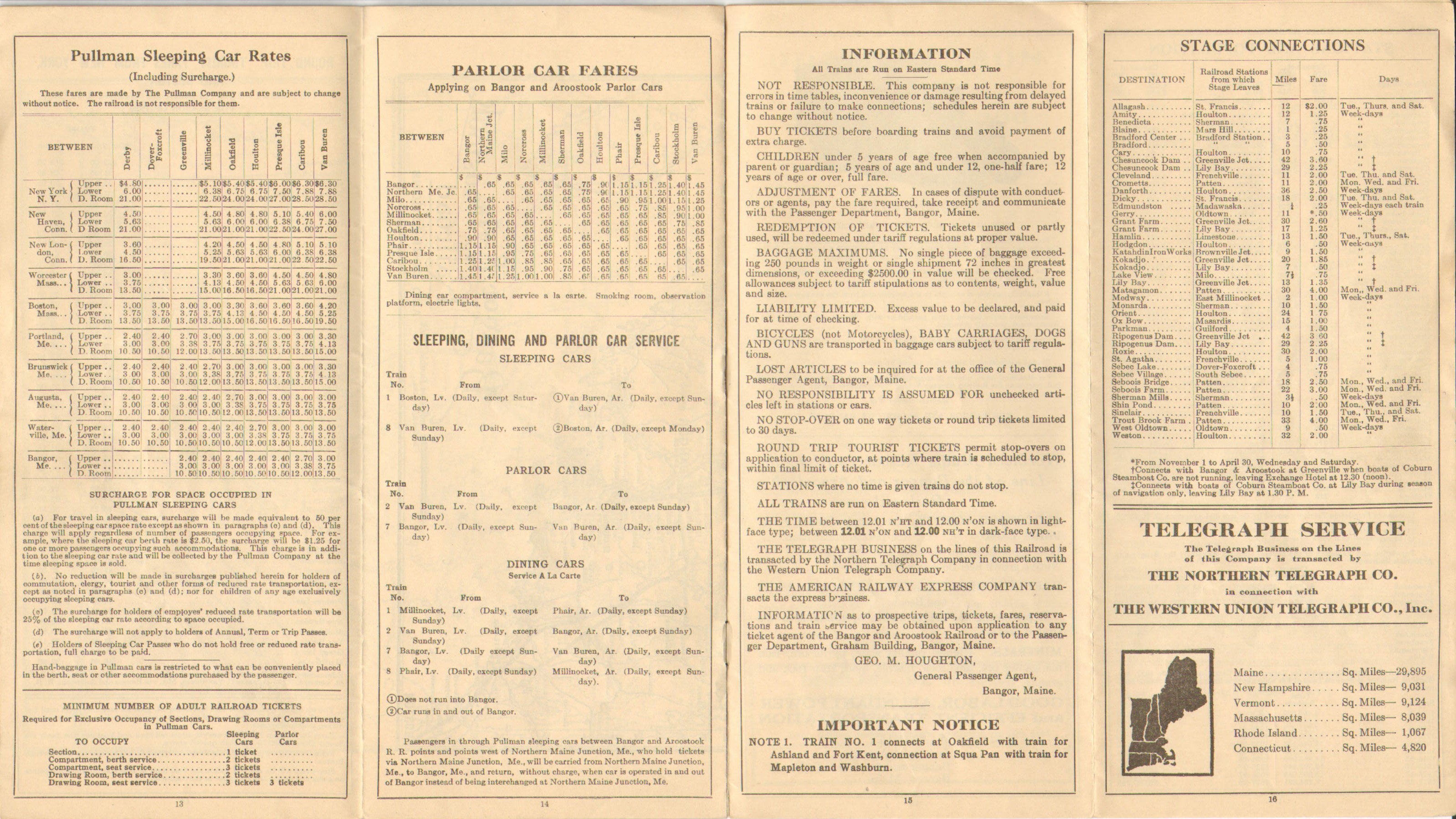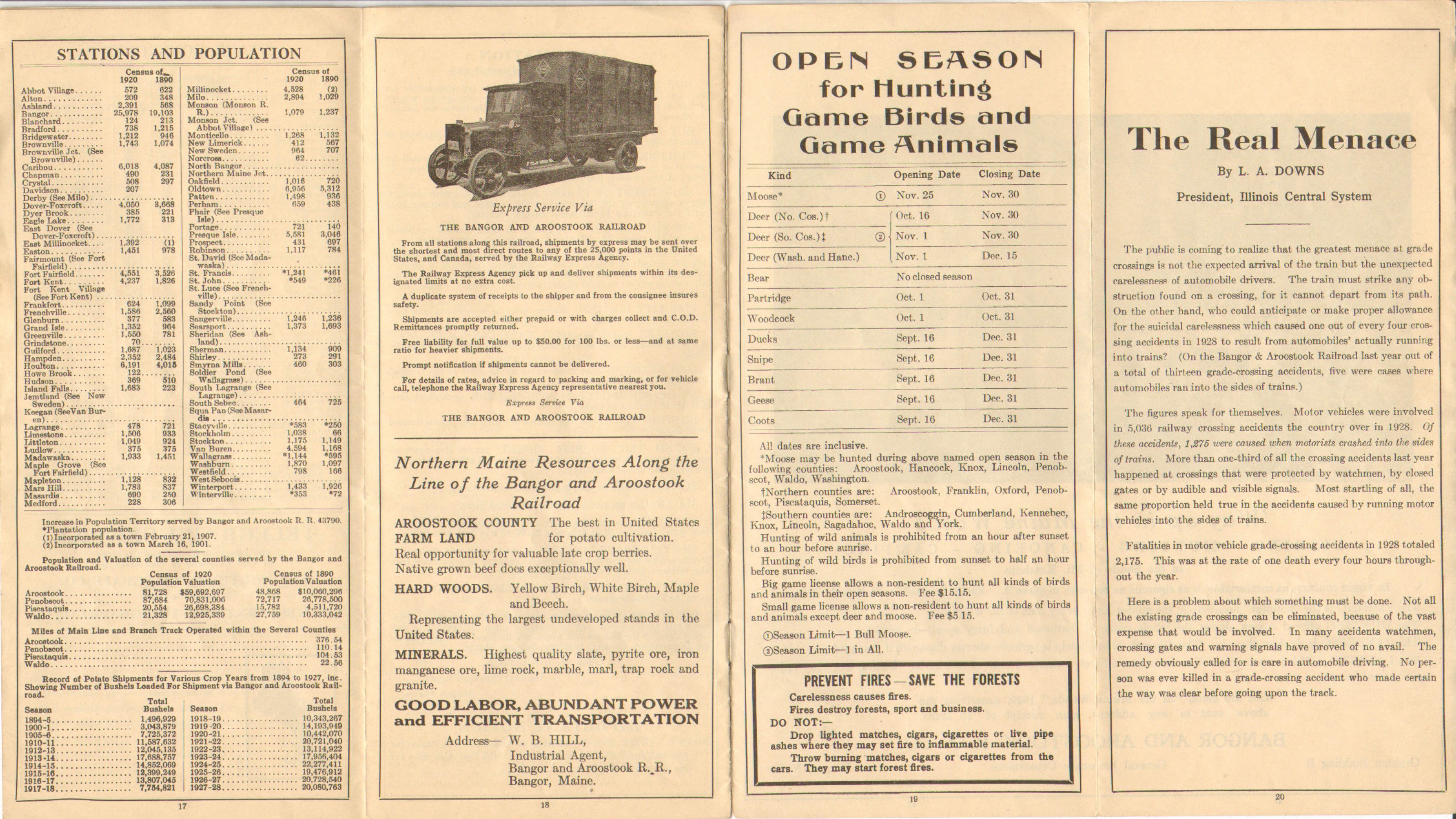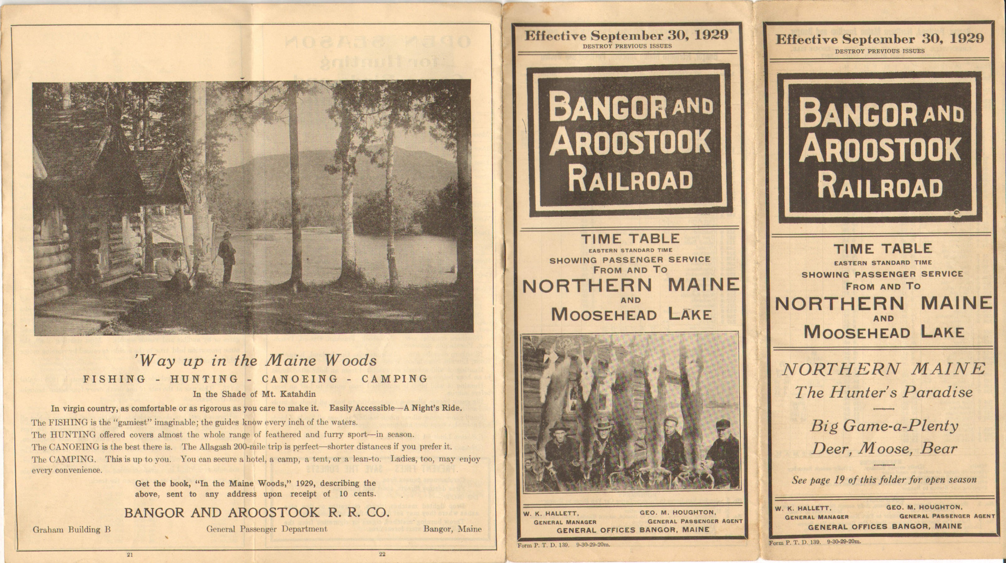 Although no one knew it at the time, the Crash of 1929 is less than a month away from when this timetable went into effect. Hunting has replaced fishing on the covers, 'In the Maine Woods' is still available for 10 cents. Sleeping car service is still being promoted from Boston. Mixed trains are being offered across the system and service to Old Town from South LaGrange is down to a pair of mixed trains per day. Service on this line would be discontinued in a few years, although no one knew it at the time.