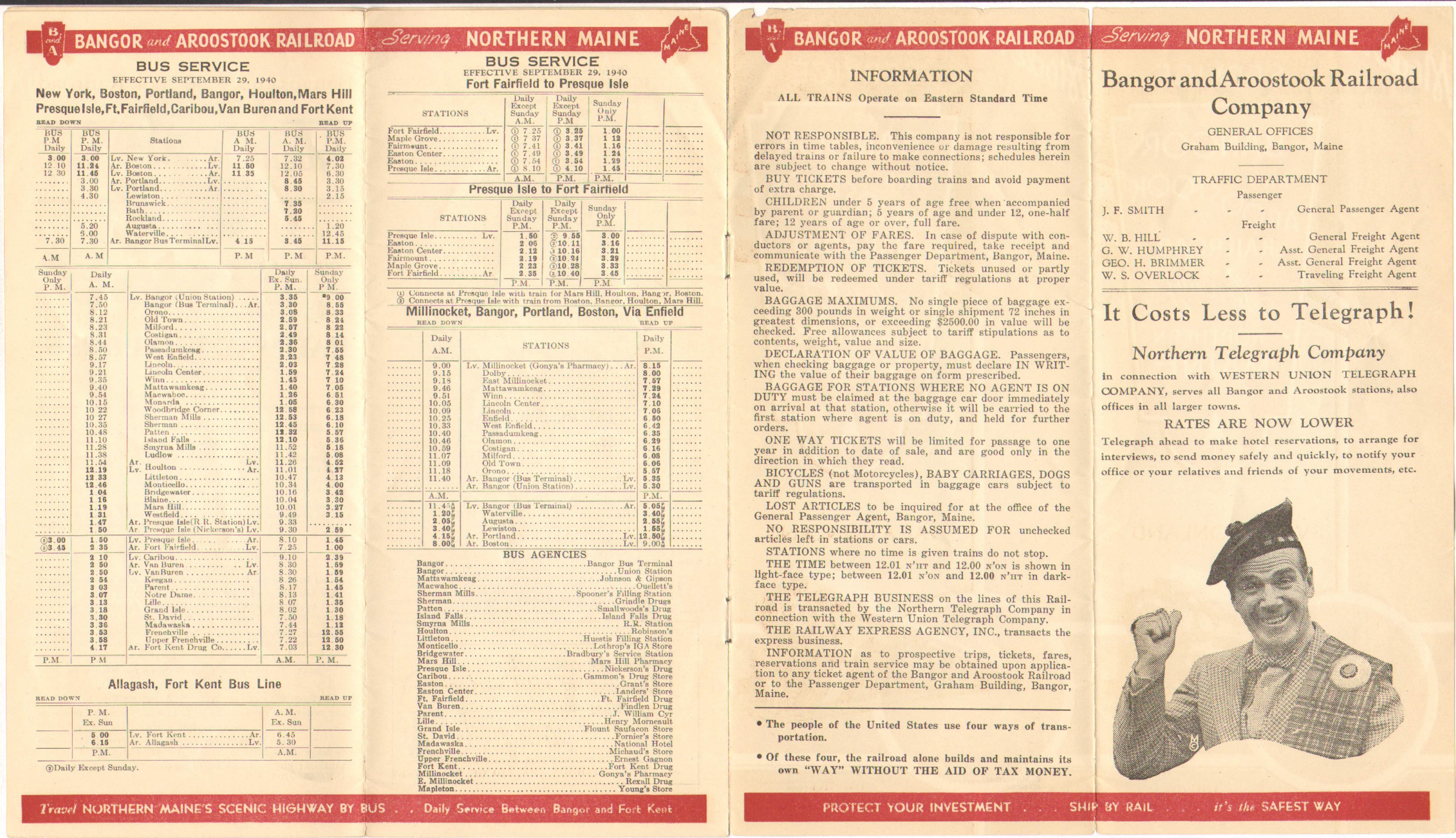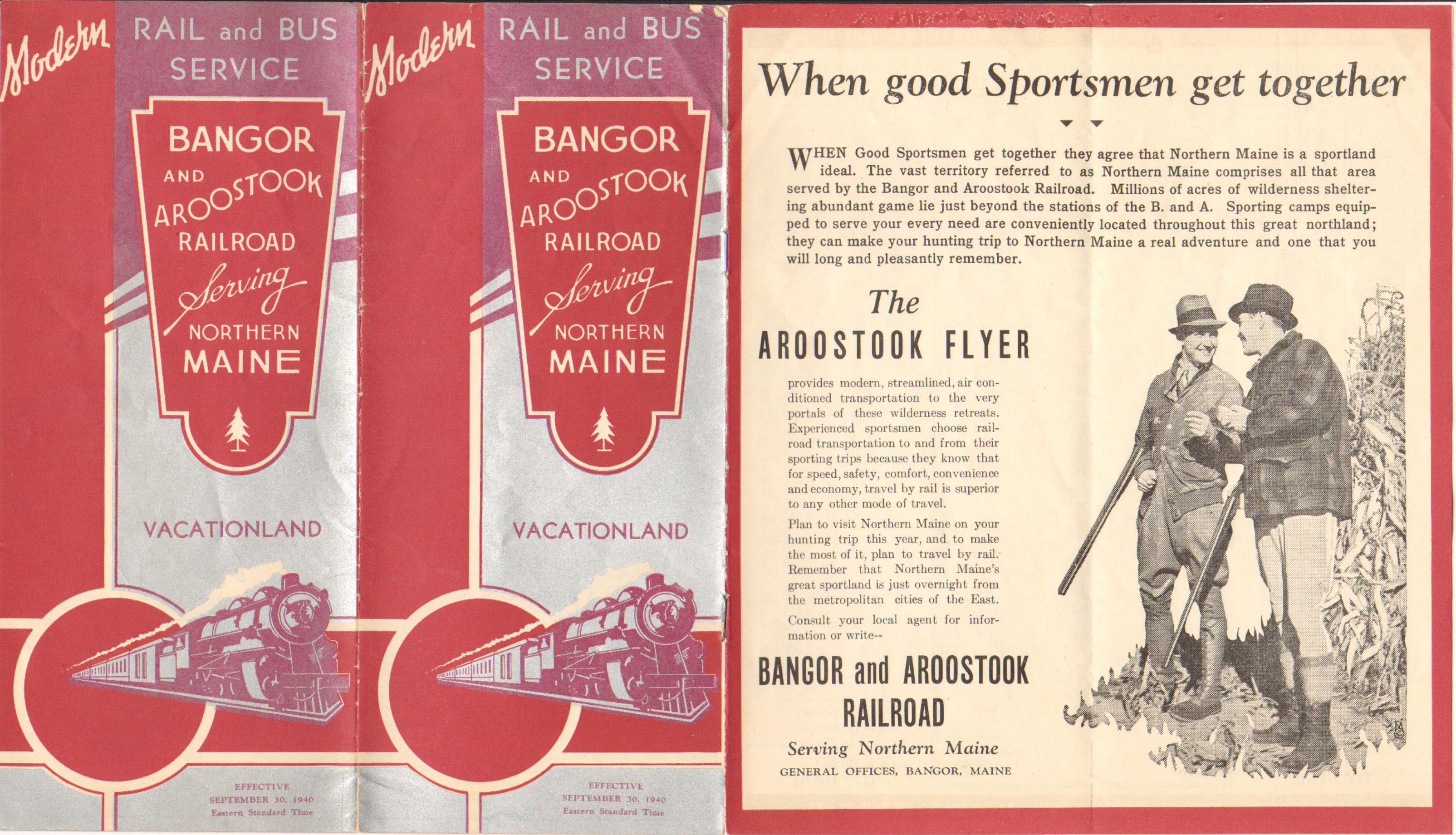 In the style department this one is sort of a mash-up of the last two timetable styles. The State of Maine is no longer present and we have gone back to the steam loco and keystone from the style before last. However, we have a red theme on this one and the word Modern has been added off to the left. Rail and Bus Service is now above the keystone and Vacationland is below it. Interestingly, Vacationland has been on Maine's license plates since 1936, making the railroad a bit slow on the uptake on this one. Inside the double page ad is about Sportsman and the Aroostook Flyer. The Timetable pages themselves retain the top and bottom borders, although in red this time, matching the front cover. The REA advertisement no longer mentions a dog, but we are invited to visit the kitchen. The largest change in the bus department seems to be the addition of a service between Allagash and Fort Kent.